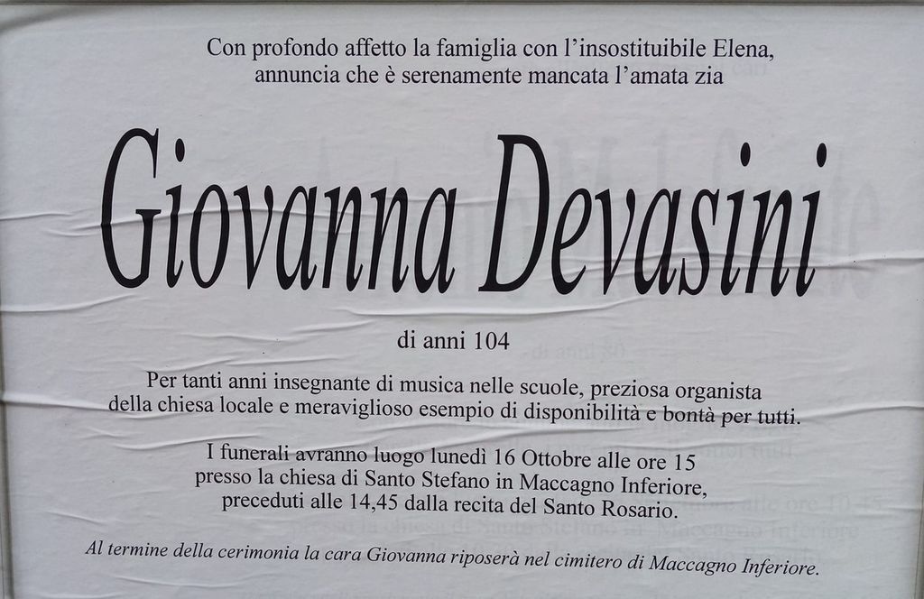 Il funerale di Giovanna Devasini verrà celebrato lunedì 16 ottobre alle ore 15 nella chiesa di Maccagno inferiore: le spoglie riposeranno nel piccolo cimitero locale.