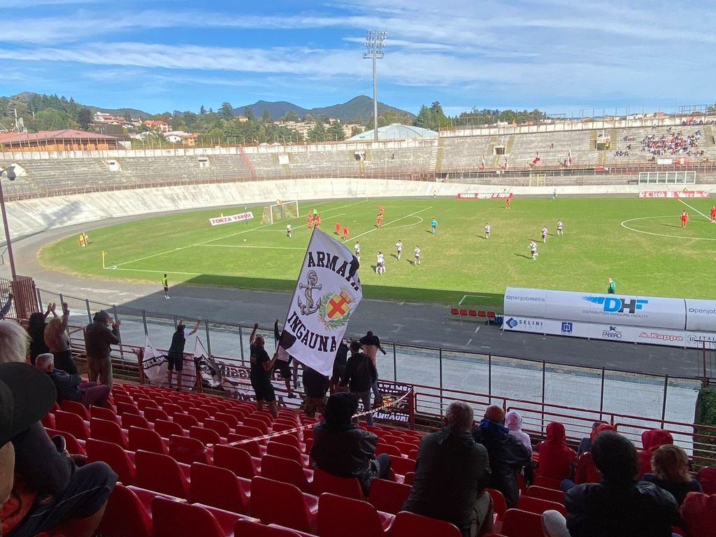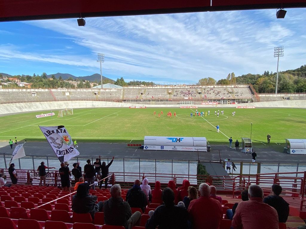 Entriamo in diretta da Masnago: soffia un vento molto forte e fastidioso, anche se non fa freddo. Presente nello spicchio sinistro della tribuna, sotto di noi, la curva dell'Albenga con bandiere ("Armata Ingauna") e striscioni.
