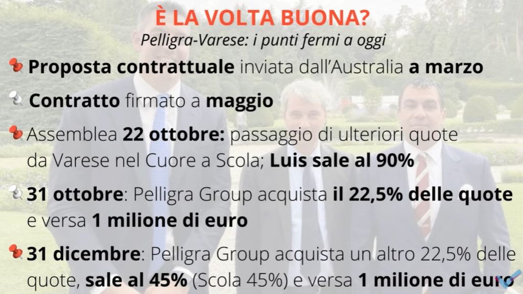 Sull’affare Pelligra, che potrebbe finalmente essere in dirittura d’arrivo (foto in fondo all’articolo con le prossime tappe): «Io da questa parte vedo tante belle parole ma nulla che avvenga nelle tempistiche che dovrebbero essere rispettate. Questa è una mancanza di rispetto nei confronti di Pallacanestro Varese, che è prima di tutto è la città e i tifosi, primo valore aggiunto. Così parti male».
