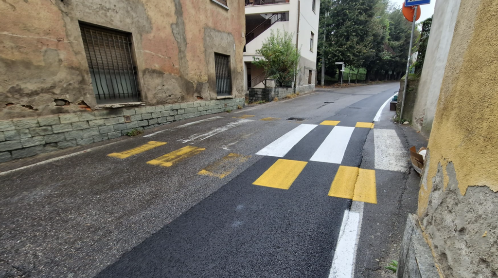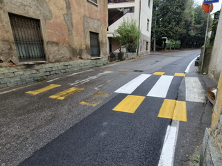 Si nota chiaramente che le strisce pedonali preesistenti sono consumate e quasi illeggibili, mentre quelle nuove sono state ripristinate solamente lungo la parte di asfalto appena posato a richiudere i condotti della fibra.