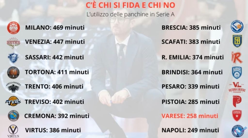 Sul tema della difesa biancorossa è emerso che in diverse voci statistiche la Openjobmetis occupa i bassifondi della classifica della LBA (immagine in fondo). Sul tema, invece, dell’utilizzo dei giocatori in uscita dalla panchina i biancorossi sono penultimi (immagine in fondo), davanti alla sola Napoli. Questione, quest’ultima, resa maggiormente interessante a fronte del doppio impegno.