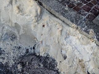 Questa sostanza bianca, dall'aspetto di un impasto, occupa più di un metro lungo il marciapiede nei pressi di un attraversamento delle strisce pedonali. Molti cittadini guardano incuriositi e perplessi questa sostanza che si appicca alle suole delle loro scarpe. I marciapiedi nei dintorni, inoltre, sono imbrattati dalle impronte di quella che sembra essere farina.