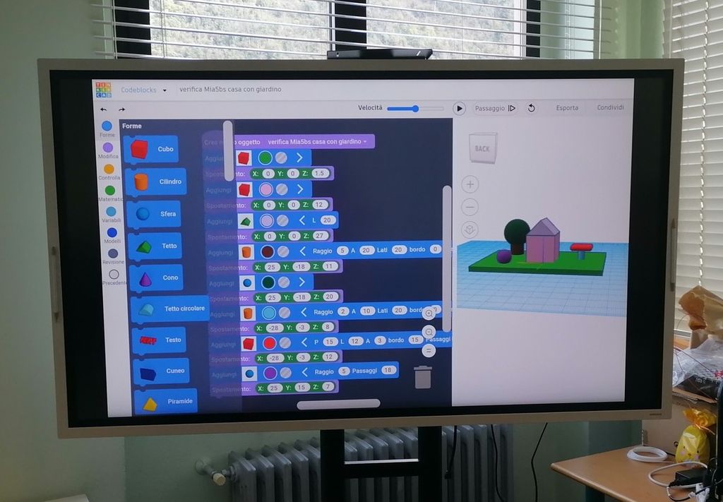 Un percorso lungo cinque anni, che parte da semplici programmazioni a blocchi (prima e seconda), per poi transitare verso la creazione di storie multimediali e semplici videogiochi (terza); quindi il passaggio al lavoro con linguaggi e attività di programmazione di hardware (motori, sensori, led), in particolare di creazione di prototipi su scheda Microbit (quarta); il gran finale, in quinta, con l'utilizzo di codici per creare modelli tridimensionali che vengono poi realizzati concretamente con stampante 3D (in dotazione) che modella filamenti PETG: un modo efficace per verificare la fattibilità del progetto ed avviare una riflessione sui diversi step di una progettazione in cui il risultato non sempre rispecchia il progetto iniziale.