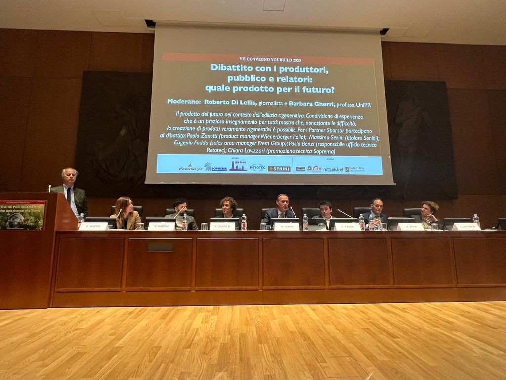 Dunque un traguardo importante per l’azienda di Montichiari che sul tema è stata precorritrice, avendo da sempre, una mission aziendale che parla chiaro: “Lavoriamo per il benessere dell’Uomo e dell’Ambiente”. In un contesto eccellente pertanto, questo convegno ha proposto una tesi alquanto stimolante, ovvero quella di capovolgere l’impatto ambientale delle costruzioni, per fare in modo che un edificio non solo abbia un consumo di energia pari a zero, ma riesca addirittura ad accrescere il benessere e a migliorare l’impronta di carbonio. In sintesi: diventi rigenerante sia per il pianeta sia per la salute umana. I relatori presenti davanti a una fitta platea di architetti, ingegneri, geometri e periti, hanno portato a supporto dati, schemi, case history. Con un obiettivo: dimostrare che si può fare. Certo per superare il concetto di green, oltrepassare quello di sostenibilità e arrivare ad una progettazione che utilizzi sistemi e materiali completamente a impatto zero, la strada è ancora lunga, ma i relatori ne sono convinti. Così, dopo l’introduzione di Emanuele Naboni, Unipr, Royal Danish Academy, UNSW, Norman Foster Institute, School of Sustainability di Mario Cucinella e di Livia Randaccio, direttore editoriale di YouBuild, ne hanno dato ampia testimonianza Cesare Battisti, presidente di Living Future Europe, che ha illustrato la sostenibilità rigenerativa di prodotto; Giambattista Brizzi, Senior Sustainable Consultant a Deerns, che parlando di data driven regenerative design ha sottolineato l’importanza del ruolo dei materiali; Barbara Pollini, designer e docente alla Naba di Milano, che ha discusso di Biodesign e Design Bioricettivo; Ilaria di Blasio, Fraunhofer Italia, che ha posto l’accento sull’integrazione delle tecnologie digitali nei processi edilizi per una maggiore efficienza e sostenibilità; Leonardo Belladelli, Politecnico di Milano e Università di Parma, che ha affrontato il tema del design rigenerativo; Furio Barzon, Modular Building Institute, che ha invece evidenziato il contributo alla decarbonizzazione dei produttori di componenti edilizi, per allinearsi entro il 2030 al milestone europeo della riduzione del 55% di CO2; Alessio Battistella, Dipartimento di Architettura e Studi Urbani del Politecnico di Milano, che ha spiegato al pubblico il concetto di costruzione, che riguarda metodi di costruzione reversibili e il loro potenziale ruolo nel campo dell’edilizia rigenerativa; Valentina Torrente, Engineer, Creative Content Strategist a Mario Cucinella Architets, che ha infine discusso di Bio -inspired, bio-based and healty materials sempre più al centro dei progetti di MCA.
