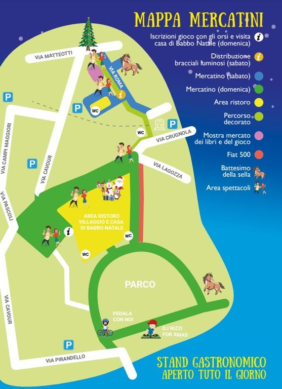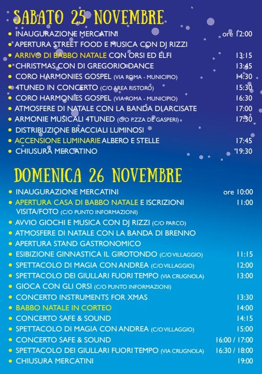 A farla da padrone saranno le bancarelle del mercatino di Natale, dove si potranno trovare diversi articoli quali creazioni artigianali, idee regalo e varie specialità gastronomiche. Il sabato, dalle 12, gli stand saranno posizionati lungo via Roma, e il pomeriggio sarà allietato dalla musica con cori gospel e bande che suoneranno i tipici canti di Natale. La giornata si concluderà alle 17.45 con l’accensione delle luminarie e dell’albero di Natale in piazza De Gasperi.