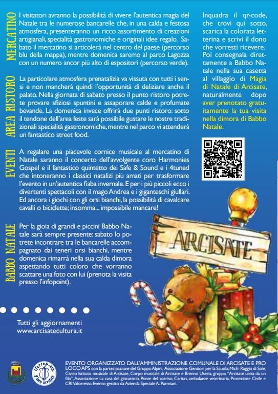L’evento sarà spalmato su due giorni: sabato 25 e domenica 26 novembre, e si snoderà tra via Roma, arteria principale del paese, e il parco Lagozza. L’evento è organizzato dalla Pro Loco di Arcisate, con il supporto dell’assessorato alla Cultura del Comune e numerose associazioni locali.