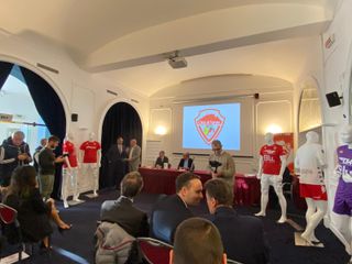 En passant si stanno presentando le maglie rossa, bianca e viola, quella storica utilizzata nell'anno del centenario
