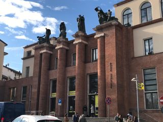 Il palazzo fu costruito tra il 1932 e il 1933 dall’architetto Mazzoni a ridosso delle stazioni, viste le direttive del tempo che imponevano uno stretto rapporto tra pubblica amministrazione e trasporti. La struttura è composta essenzialmente da tre materiali: intonaco, mattone e marmo. Le quattro statue in bronzo posizionate in cima all’edificio sono alte 3 metri e rappresentano le allegorie della comunicazione. Per l’occasione anch’esse sono state pulite e cerate