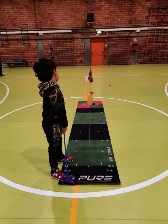 Ovviamente il materiale utilizzato è riadattato sulla base delle esigenze dei ragazzi: bastoni a misura non tradizionale con la testa di plastica, palline più grandi di gomma piuma e ovviamente anche buche più grandi.
