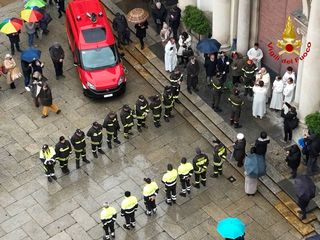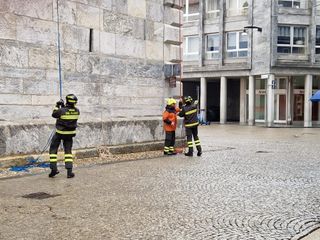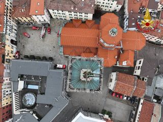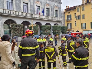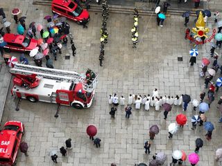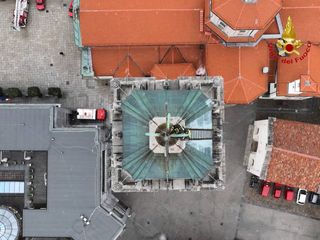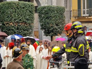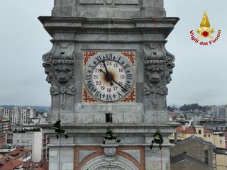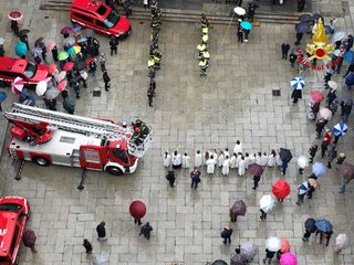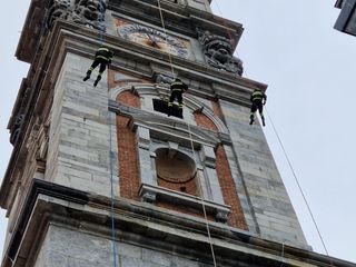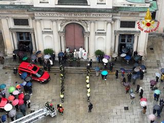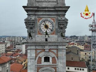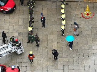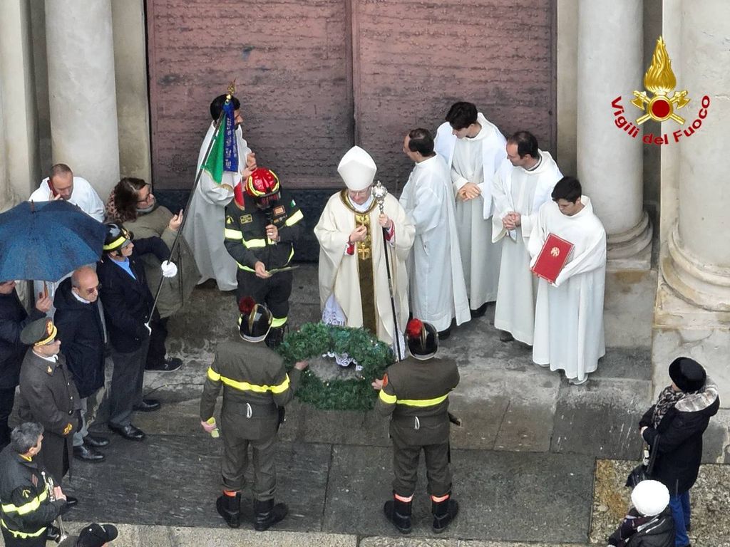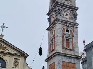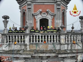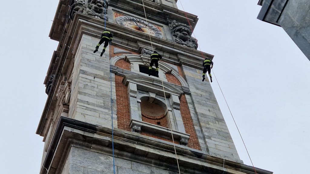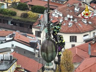 Con i mezzi in dotazione e tecniche alpinistiche e tra la curiosità di tanti passanti che si sono fermati ad ammirare le operazioni spettacolari, i vigili del fuoco hanno scalato gli oltre 70 metri del campanile sotto lo sguardo, oltre che di molti cittadini, del prefetto Salvatore Rosario Pasquariello, del prevosto Luigi Panighetti e del comandate provinciale del Corpo Mario Abate. Una tradizione che il maltempo di questa mattina non ha rovinato.
