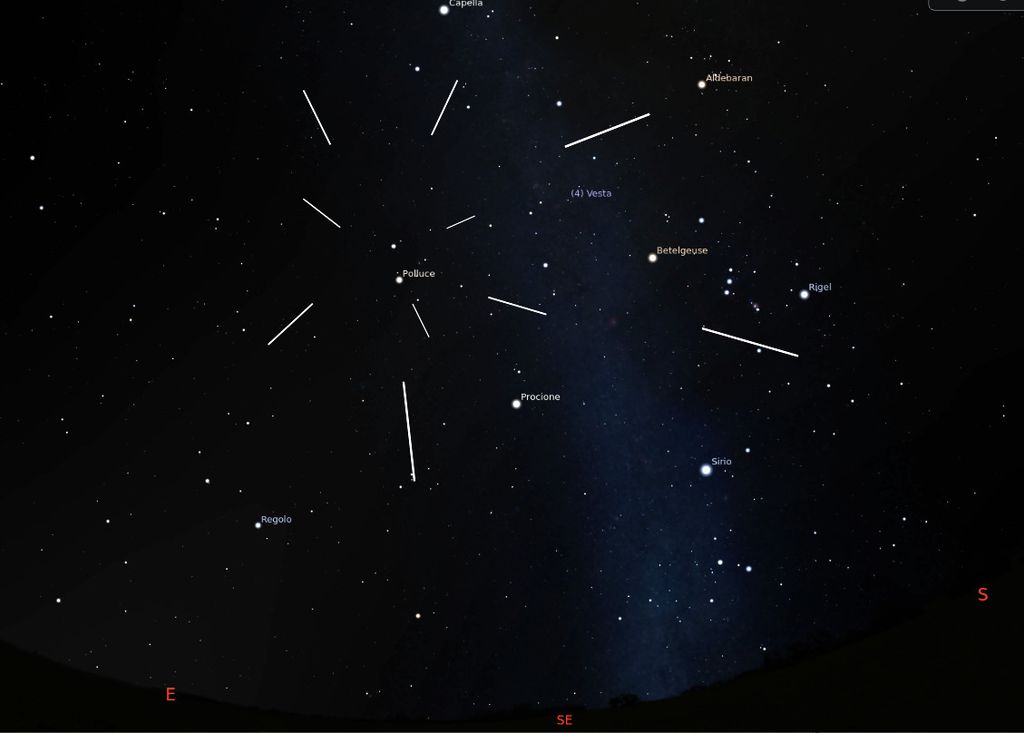La foto, scattata da Paolo Valisa, il 14 dicembre verso le ore 22, mostra una "geminide" che transita nella costellazione del Toro. «La cartina (in allegato, ndr) illustra la posizione del "radiante", punto del cielo da cui sembrano provenire le stelle cadenti, non lontano dalla stella Castore della costella zione dei Gemelli». C'è ancora qualche giorno di tempo per ammirarle.