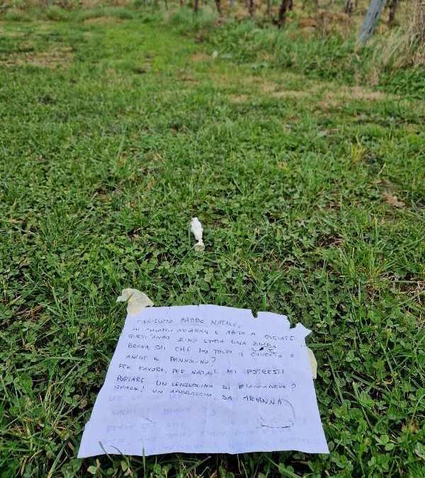 «Caro Babbo Natale, ha volato per mezza Italia questo palloncino! – si legge nel post pubblicato sulla pagina Facebook dell’agriturismo la vigilia di Natale –. Stanotte porta il regalo alla bimba! Ecco la letterina di Arianna scritta sicuramente da mamma e papà che aspettiamo prima o poi tra le nostre vigne».