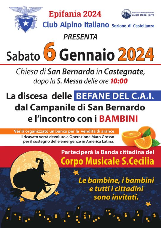 Sabato 6 gennaio si inizia la mattina con la sezione cittadina del CAI Club Alpino Italiano che propone alla Chiesa di San Bernardo in Castegnate alle ore 11, dopo la S. Messa delle ore 10, la tradizionale discesa delle befane dal campanile della chiesa e l'incontro con in bambini. Verrà inoltre organizzato un banco per la vendita di arance. Il ricavato sarà devoluto all'associazione Operazione Mato Grosso per il sostegno alle emergenze in America Latina. Parteciperà la banda cittadina del Corpo Musicale Santa Cecilia. Le bambine, i bambini e tutti i cittadini sono invitati.