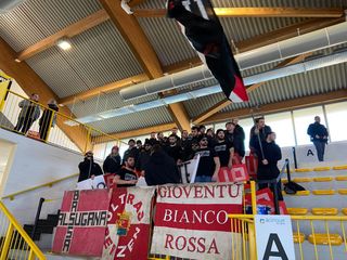 49' Prima della squadra, stanno vincendo i tifosi del Pergine, tambureggianti e caldissimi nel loro tifo con tamburi e bandiere