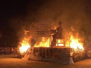 Dopo il massimo riserbo su che cosa avrebbe rappresentato il fantoccio, finalmente questa sera il tema è stato scoperto: la maleducazione. Su una struttura in legno e cartapesta, una Giöbia sedeva davanti ad una lavagna con una bacchetta puntata, come una maestra che insegna.