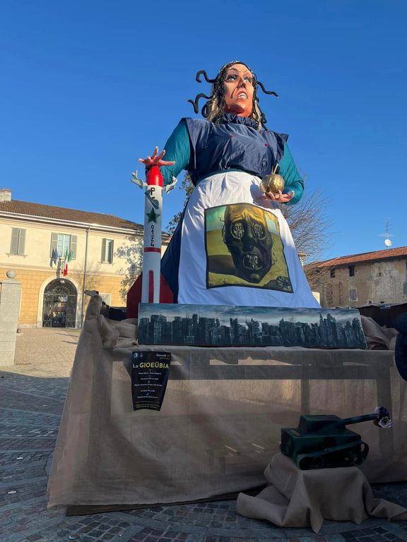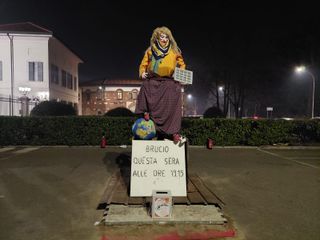 La vecchia, realizzata dai volontari della Pro Giovani e data alla fiamme, rappresentava la Dea della Discordia, con i serpenti tra i capelli, che offre la mela dorata simbolo del conflitto. Richiamava le attuali guerre: sul grembiule, infatti, si vedeva l'opera di Dalì “Il volto della guerra”.