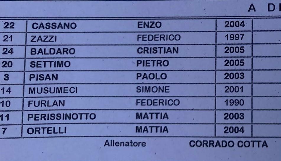 La distinta ufficiale con il numero 14 Musumeci in panchina, poi entrato in campo con il numero 23 e senza nome sulla maglia