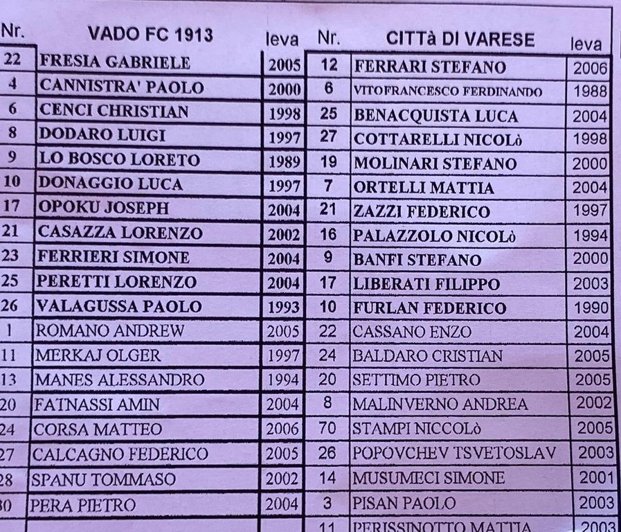 Vado (3-5-2): Fresia; Peretti, Cannistrà, Casazza; Ferrieri (Pera 22' st), Cenci (Manes 43' st), Dodaro (Spanu 48' st), Valagussa, Opoku; Donaggio, Lo Bosco (Merkaj 30' st). A disp.: Romano, Fatnassi, Corsa, Calcagno. Allenatore: Marcello Cottafava