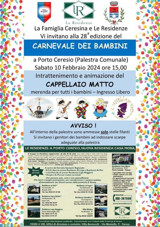 Inoltre, il giorno prima del clou della sfilata, si terrà presso la palestra comunale di Porto Ceresio il ventottesimo Carnevale dei Bambini, la festa dedicati ai più piccoli. Sabato 10 febbraio, dalle 15, un pomeriggio ricco di animazione e intrattenimento con il cappellaio matto. L’ingresso è libero, e sarà offerta la merenda a tutti i bambini partecipanti.
