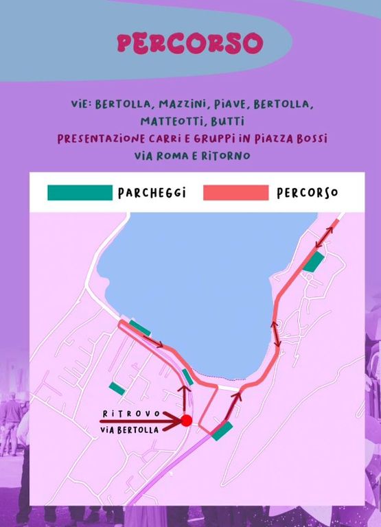 Il ritrovo è fissato alle 14 in via Bertolla. Il corteo transiterà poi per via Mazzini, via Piave, via Bertolla, via Matteotti, via Butti e sosterà in piazza Bossi, dove vi sarà la presentazione di carri e gruppi prima di ripartire lungo via Roma ed effettuare il ritorno.