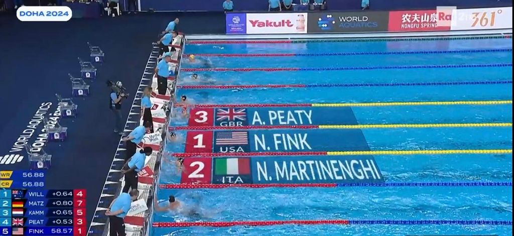 Questi i tempi: 58″57 Fink, 58″84 Martinenghi, 59″10 Peaty.
