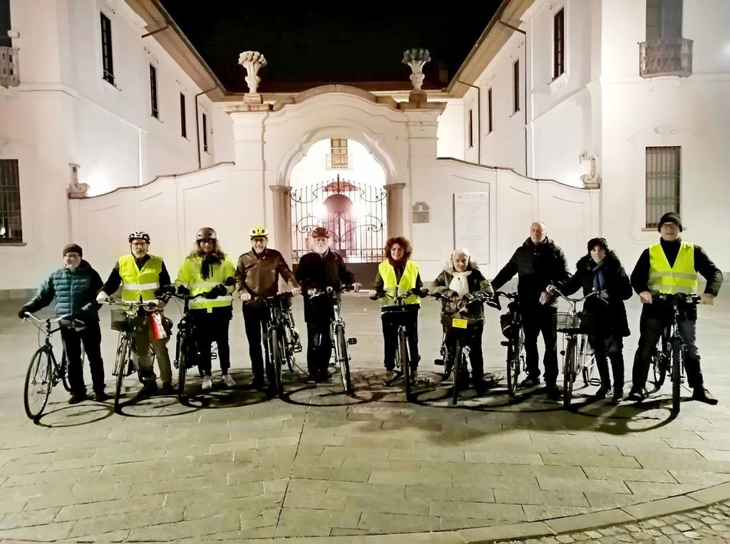 Nel suo racconto ci sono anche le note dolenti con cui i soci di Fiab e Legambiente BustoVerde hanno dovuto fare i conti: «Abbiamo pedalato, adeguatamente auto-illuminati, percorrendo strade troppo spesso piene di buche e tagli di asfalto mal rappezzati. Le vie cittadine sono ancora poco illuminate e i nuovi lampioni, spesso inglobati dalle piante preesistenti, lasciano arrivare poca luce specie sui marciapiedi, dove invece i pedoni avrebbero bisogno di vedere meglio gli inevitabili ostacoli presenti sul loro percorso. Foto finale nella piazza Vittorio Emanuele che seppur bene illuminata non riesce ancora ad essere una parte integrata nel centro storico di Busto. E le condizioni della sua pavimentazione non la aiutano davvero».