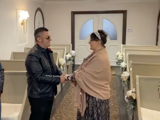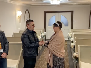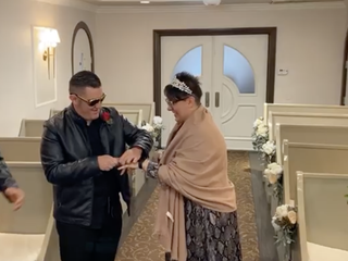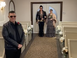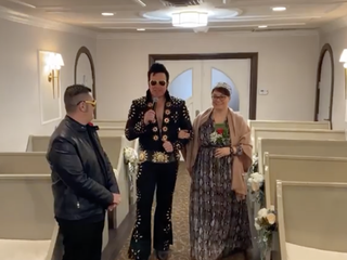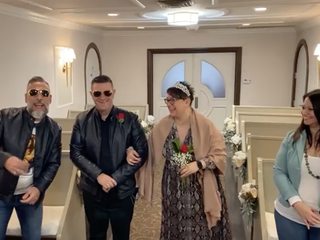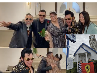 Pamela Carezzato e Lorenzo Pisani (lo conoscete anche per le sue cronache puntuali sulla Formula 1, con Stefano Sandrini, difatti alla fine non poteva mancare la foto con bandiera della Ferrari) si sono dunque sposati - di nuovo - nella Graceland Wedding Chapel, con il supporto degli amici e testimoni Ivan e Claudia e con tutto l’affetto della famiglia e degli amici trasmesso grazie al live streaming su Facebook.