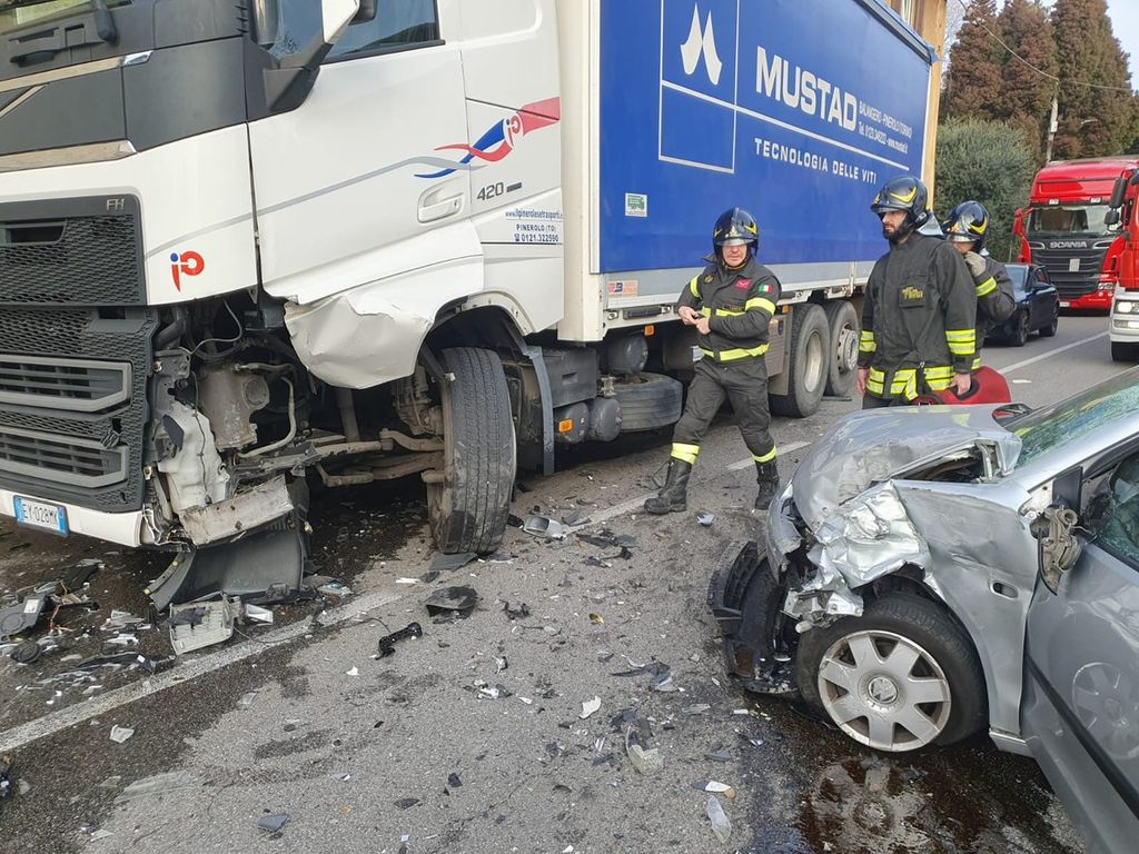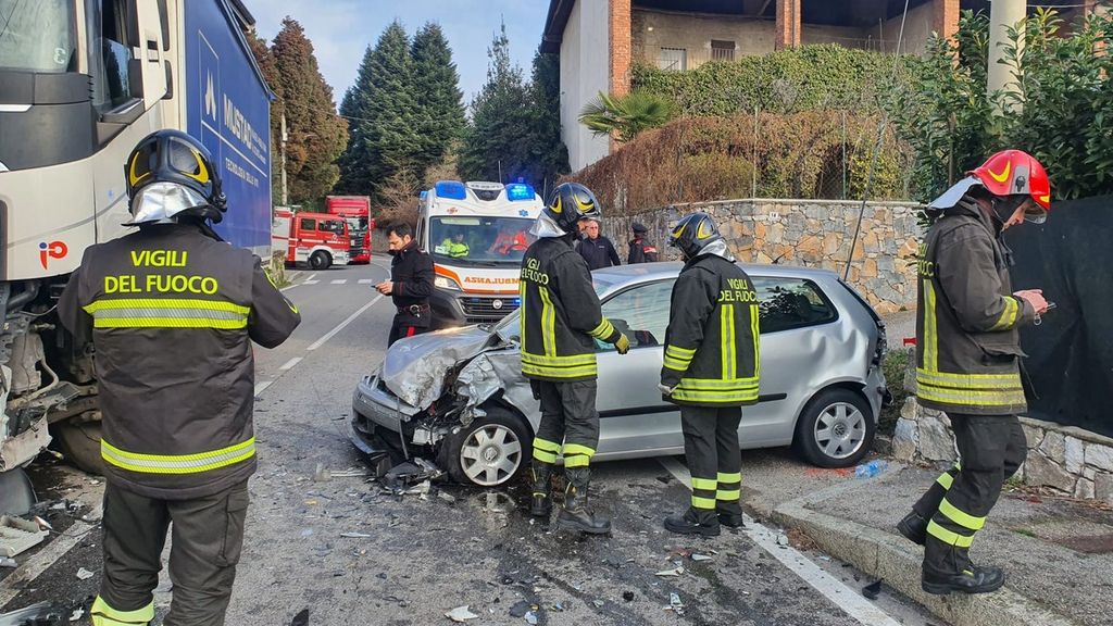 FOTO. Auto si scontra con un camion, soccorsi in azione a Travedona Monate