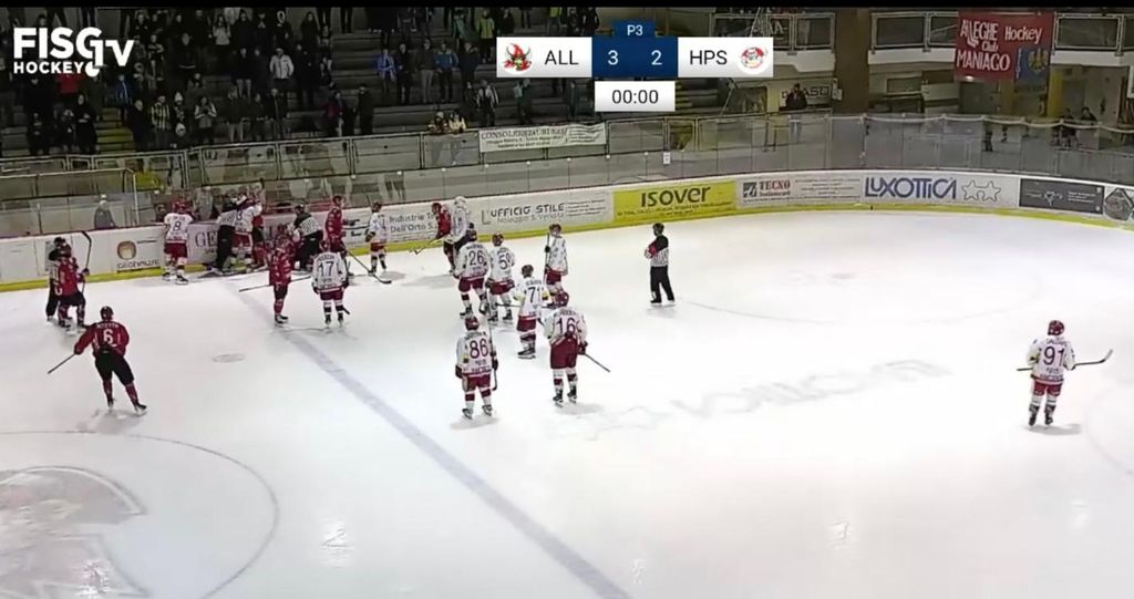 Ad Alleghe succede di tutto, anche che il Pergine abbia due minuti di superiorità poco prima della sirena perché gli avversari si fanno trovare con 6 uomini in pista, ma il cuore delle Civette batte troppo forte stasera. In due risse clamorose, una dopo la sirena, i trentini proseguono sulla loro strada che ben conosciamo (63 minuti di penalità, come all'Alleghe che ha reagito colpo su colpo) e subiscono due penalità partita, una contro Christian Buono - dopo il 60' - e l'altra contro Edoardo Manganelli. Stessa sorte per i veneti Testori e Da Col.