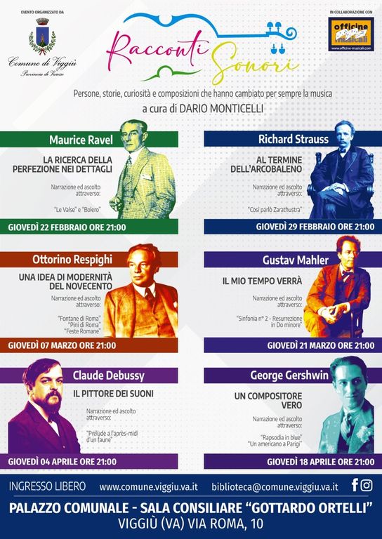 Sei incontri, dedicati ad altrettanti compositori, che si svolgeranno, con ingresso gratuito, in alcuni giovedì tra fine febbraio e metà aprile all’interno della sala consiliare Gottardo Ortelli presso il palazzo comunale di Viggiù, in Via Roma 10.
