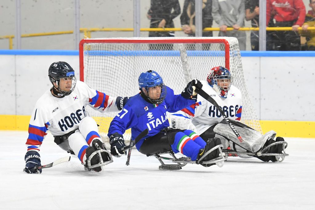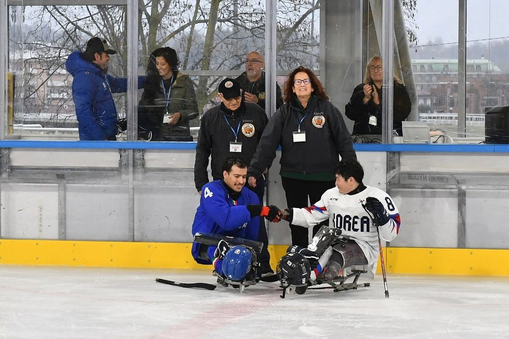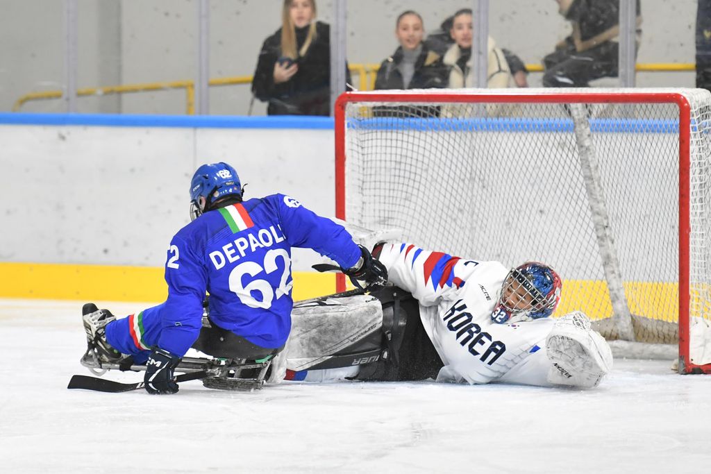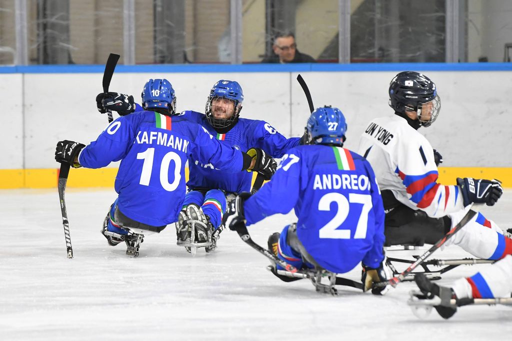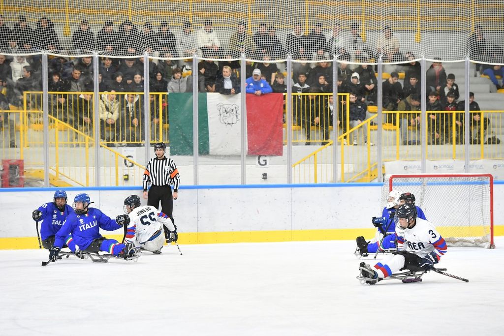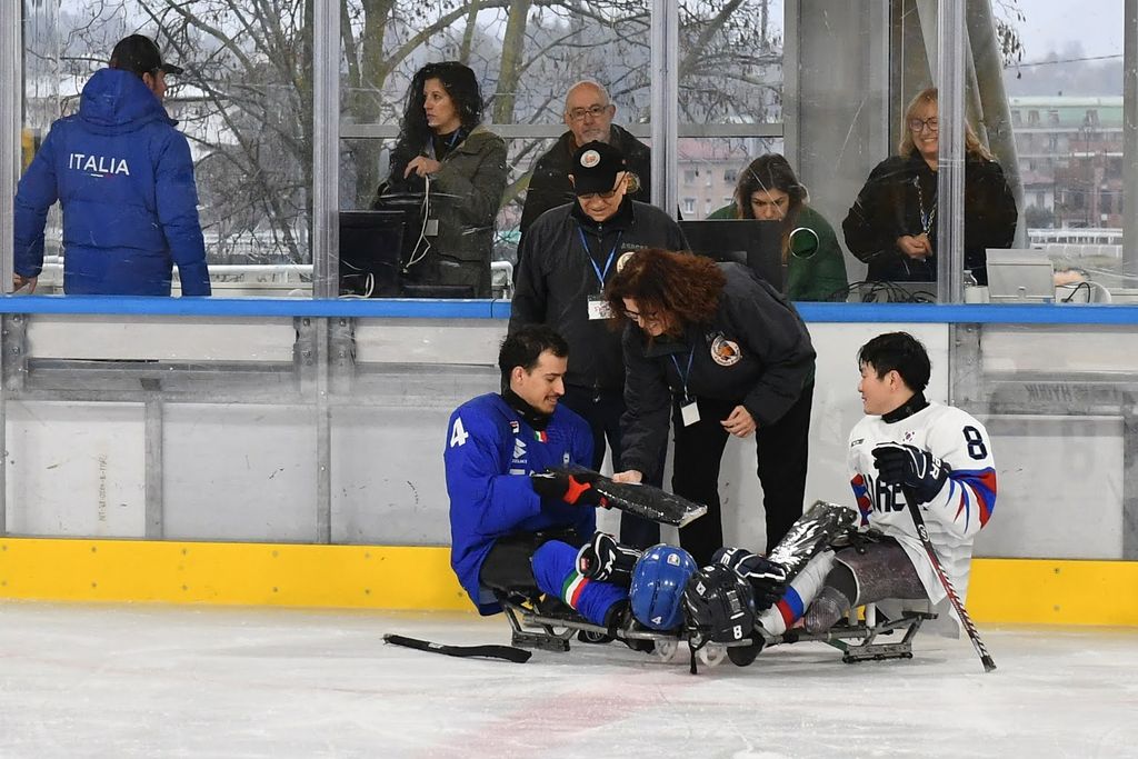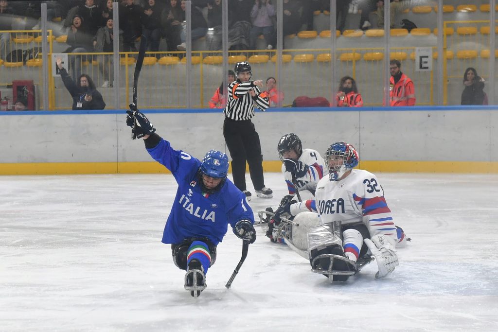 È stata una mattinata sorprendente per la capacità di trasmettere emozioni agli oltre 500 studenti e al pubblico presenti all'Acinque Ice Arena, ma anche agli atleti in pista, quella del Torneo internazionale di Para Ice Hockey "Memorial Ciaz". I ragazzi, tra bandiere tricolori, tifo sano e bellissimo, trombette e uragani di applausi hanno accompagnato gli azzurri alla vittoria per 4-3 sulla Sud Corea (primo gol di Alessandro Andreoni, ultimo e decisivo a un passo dal traguardo di Cristoph Depaoli dopo che l'Italia era stata da poco raggiunta sul 3-3: sotto nelle foto e in pdf il foglio gara), ma hanno anche intonato cori per la Sud Corea.