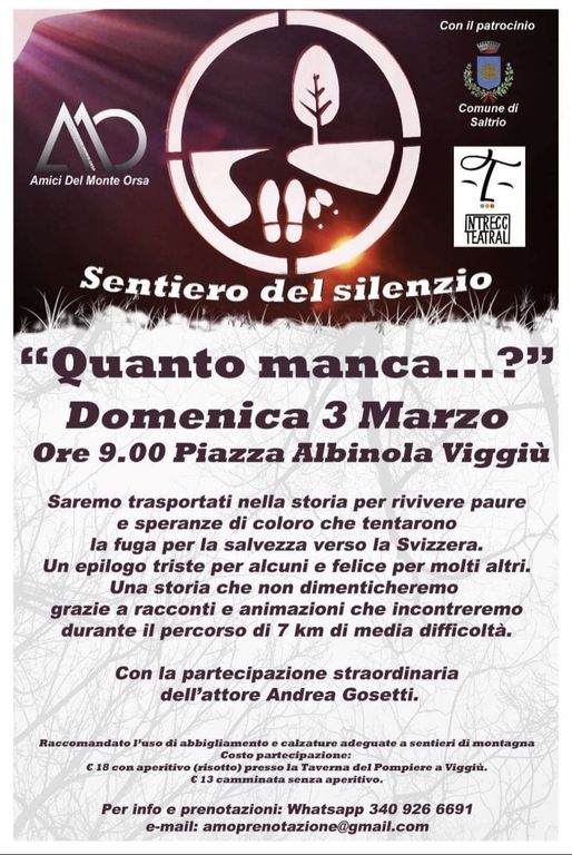 Domenica 3 marzo, l’associazione Amici del Monte Orsa e la compagnia Intrecci Teatrali uniscono le proprie forze per un evento che trasporterà nella storia i partecipanti. Una camminata intervallata da racconti e animazioni lungo il Sentiero del silenzio, inaugurato lo scorso dicembre con lo scopo di ripercorrere con esattezza i passi compiuti, tra gli altri, anche da Liliana Segre e suo papà.