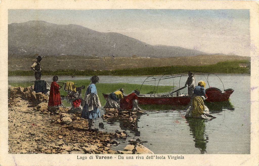 A casa mi consolerò guardando le vecchie cartoline in bianco e nero, con le barche dei pescatori che “metteven giò i reet” proprio davanti allo chalet di legno, e quelle degli innamorati che attraccavano al moletto di pietra e prendevano il sole sul praticello, prima di bagnare i piedi nell’acqua limpida del lago. Una cartolina colorata mostra addirittura le donne di Biandronno in trasferta all’Isolino a lavare i panni sulle pietre affioranti dall’acqua e i barcaioli che le osservano con il cappello in testa e l’immancabile gilet. E mi sembra di riascoltare la voce di mio padre che mi dice: «Nemm denter a r’Isula a mangià quaicoss», dopo un mattino di pesca e di sole.
