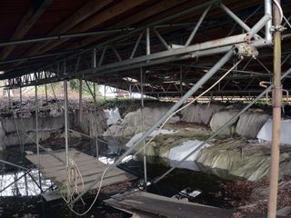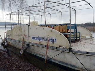 L’incubo prosegue non appena mi avvicino alla struttura del ristorante, chiuso dal maggio 2023 quando l’ultimo gestore, Luigi Lanzani, lo ha lasciato per trasferirsi a Besnate. Le porte sono piene di ragnatele così come il sottotetto della veranda a lago, e i due gazebo esterni sporchi e pieni di foglie secche. L’imbarcazione che trasportava i gitanti dalla “Strencia” all’isola è lasciata a sé stessa, senza una copertura, con ancora il motore fuoribordo e i salvagenti ormai ammuffiti legati alle panchine interne. Ai lati dello scafo, nell’acqua si vedono diverse tegole rotte e altri rifiuti, uno scenario di totale desolazione.