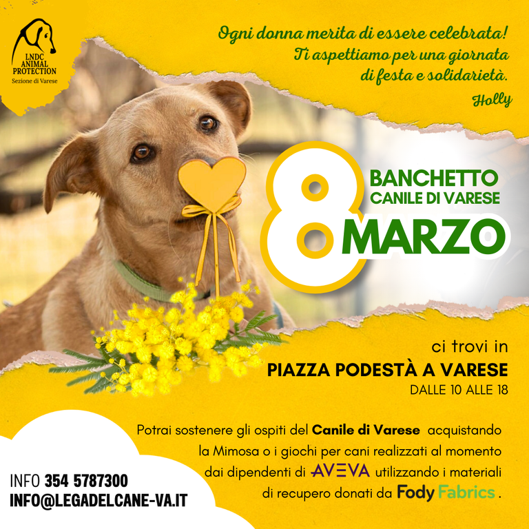 Il Canile di Varese è lieto di annunciare un evento speciale in occasione della Festa della Donna. Per celebrare questa giornata di solidarietà e supporto, il Canile terrà un banchetto nel cuore del centro di Varese.