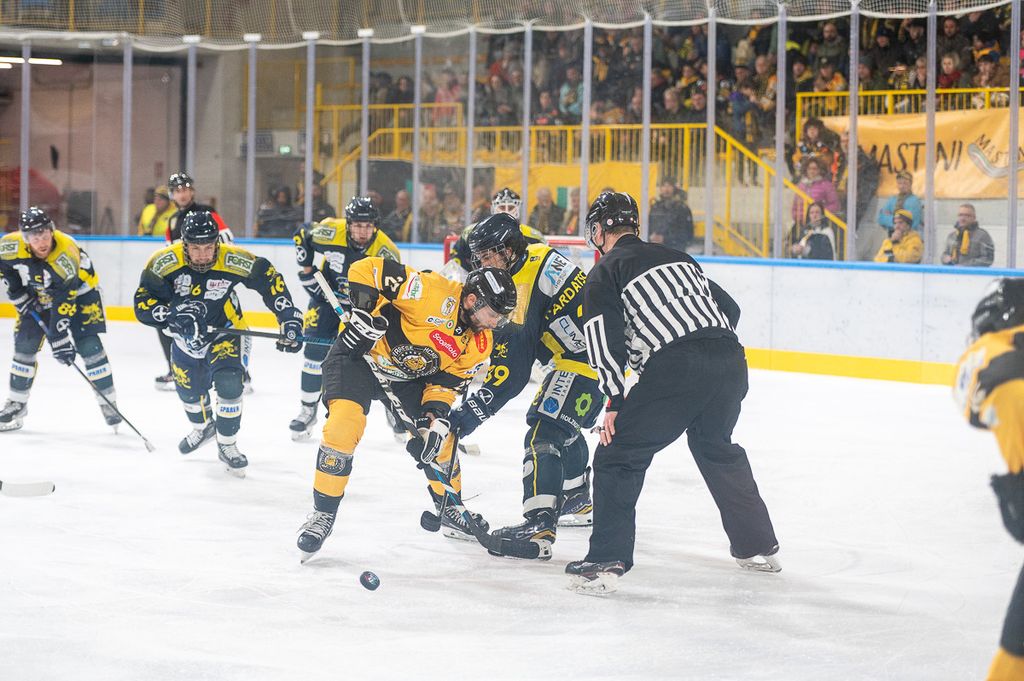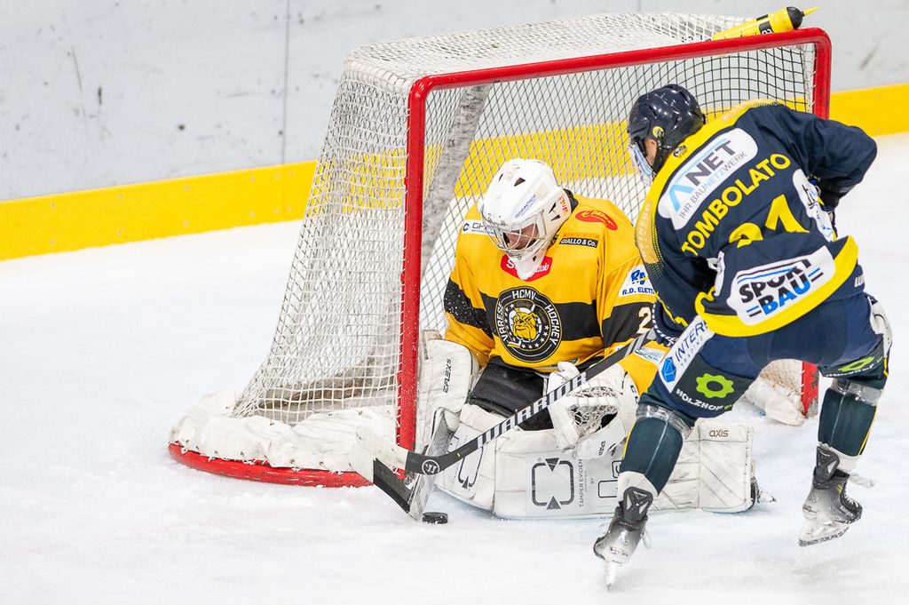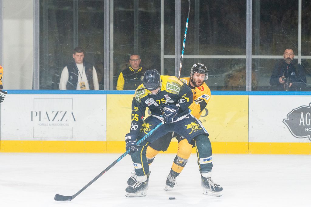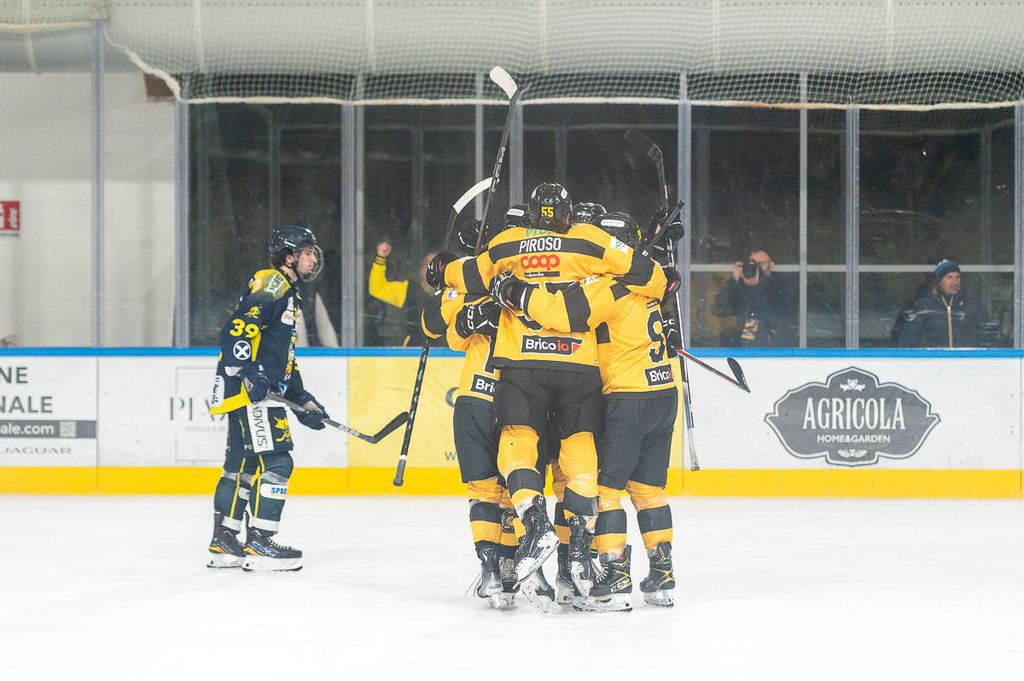 Secondo tempo da crepacuore in un ambiente da brividi: si gioca in un frastuono assordante di trombe e, così, questo pandemonio soffia fuori il disco del 3-1 di Matthias Oberrauch e anche quello di Tombolato, mentre soffia dentro quello di Marcello Borghi del 2-2, un fulmine nel pieno dell'incendio giallonero. Con quello che è capitato nel primo tempo, è il minimo. C'è anche Pietroniro, che litiga con il gol due volte: prima prova a entrare in porta con il disco, murato, poi mette fuori un tiro dei suoi. Comunque è lì a provarci e a battere sul ghiaccio come un fabbro.