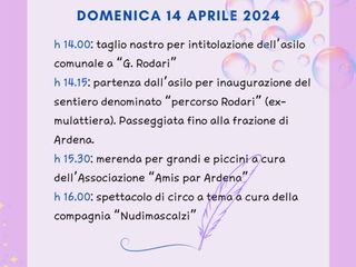 Domenica 14 aprile, infatti, avverrà ufficialmente l’intitolazione dell’asilo comunale a Gianni Rodari. Il taglio del nastro sarà alle 14, e poco dopo partirà la passeggiata che inaugurerà il sentiero che porta il nome dello stesso scrittore.