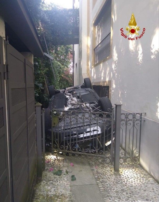 Incredibile incidente nel Verbano: auto cade da una piazzola incastrandosi contro il muro di una casa