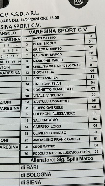 Varesina: Basti, Perin (Amoabeng 1' st), Grieco, Gasparri (Polenghi 42' st), Manicone (Oboe 15' st), Orellana Cruz, Bigoni (Ciuffo 1' st), Gritti, Gatti, Coghetto, Vitale (Sali 19'). A disp.: Santulli, Carrino, Olivieri, Rodolfo Masera. All. Marco Spilli.