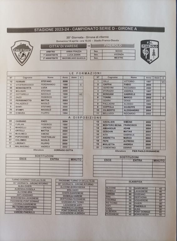 Il Varese quasi al completo (mancano Bernacchi e Pisan) alle 15 al Franco Ossola contro un Pinerolo a caccia di punti salvezza tenta di chiudere alla grande: quattro gare alla fine e l'allenatore Cotta con i suoi ragazzi prova a difendere il terzo posto e salire ancora più su con una squadra completamente rifatta dopo la retrocessione in Eccellenza.