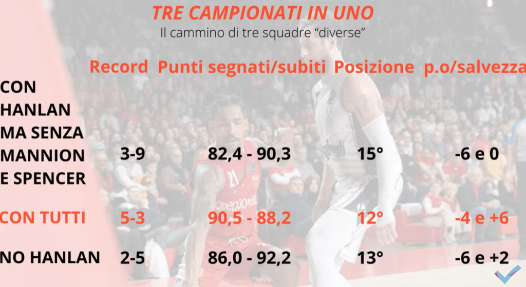 Con i numerosi cambiamenti di roster avvenuti in questa stagione, interessante è stata l’analisi dei record delle tre versioni della Varese 2023/2024: una con Hanlan ma senza Mannion e Spencer, una con tutti e tre e l’ultima senza Hanlan (immagine con i dati in fondo).