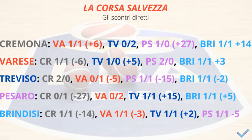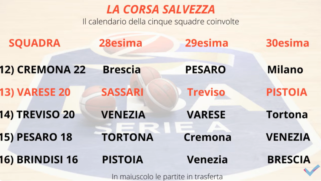 A tre giornate dalla fine del campionato, si è andati a dare un’occhiata al calendario delle cinque squadre (Varese compresa) ancora non aritmeticamente salve. Importante, a proposito del rush salvezza, anche la situazione degli scontri diretti (nelle immagini in fondo le grafiche relative a entrambi i temi).