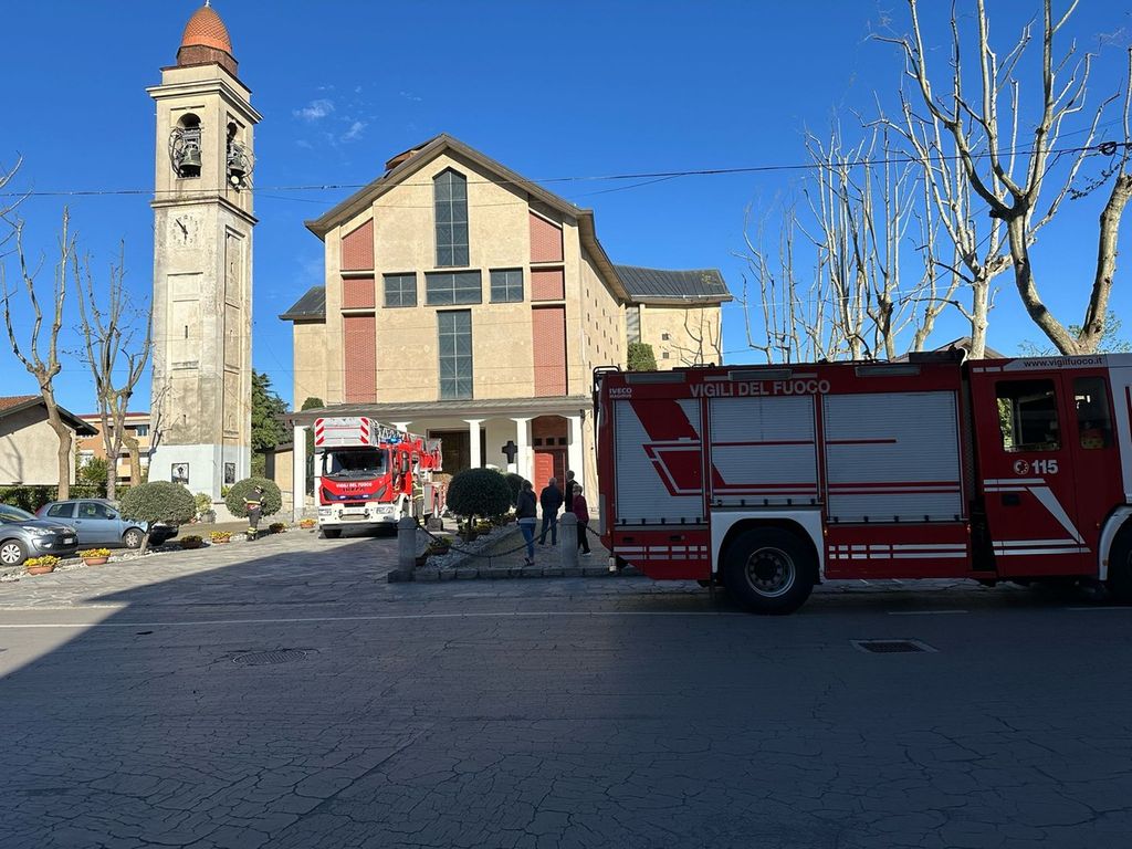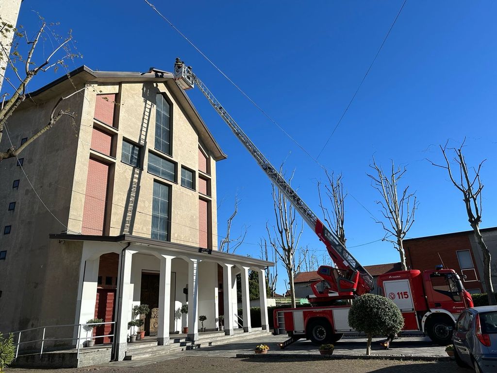 Pluviale pericolante per il vento forte. Intervento dei vigili del fuoco alla chiesa di Verghera