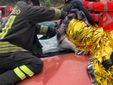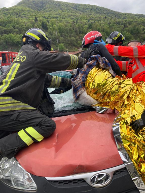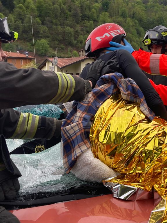 Le immagini dell'intervento dei vigili del fuoco di Luino che hanno liberato il ciclista investito rimasto incastrato nel parabrezza
