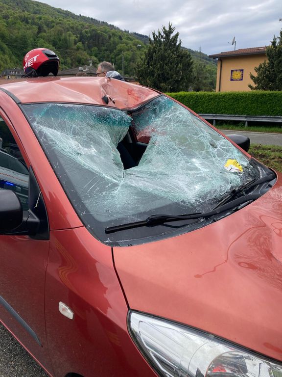 FOTO. Ciclista investito da un'auto a Cremenaga sfonda il parabrezza e rimane incastrato con un braccio: liberato dai vigili del fuoco