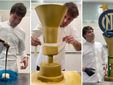 Quando a festeggiare lo scudetto della propria squadra del cuore è un pasticcere ecco cosa succede: una scultura di cioccolato alta un metro mezzo e pesante quindici chili per celebrare il tricolore dell’Inter.