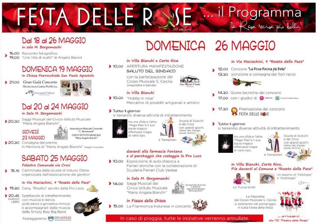 Induno Olona si prepara per l'edizione numero centoundici della Festa delle Rose. Nove giorni di eventi per uno degli eventi più storici della Valceresio e non solo, organizzato dall'amministrazione comunale con la Pro Loco e il Roseto della Pace.