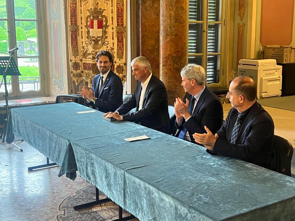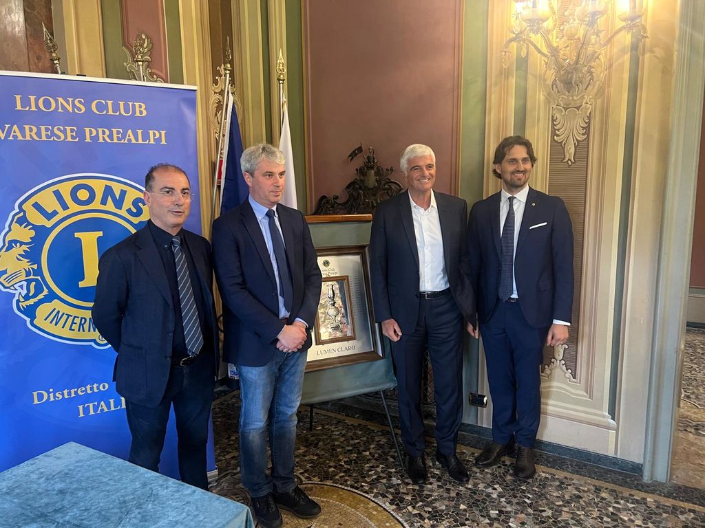 Antonio Belloni, secondo da destra, premiato in Salone Estense dal Lions Club Varese Prealpi con il Lumen Claro