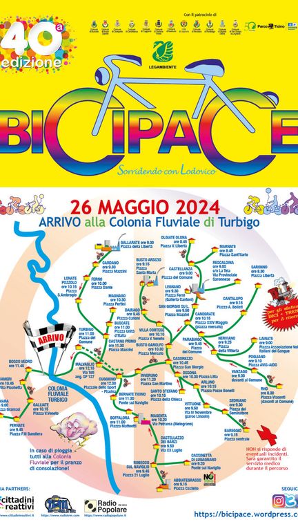 Appuntamento domenica 26 maggio con la quarantesima edizione dell’iniziativa BICIPACE. La manifestazione, organizzata da Legambiente, partirà da una dozzina di luoghi e attraverserà oltre 50 comuni per concludersi alla Colonia Fluviale di Turbigo.