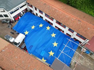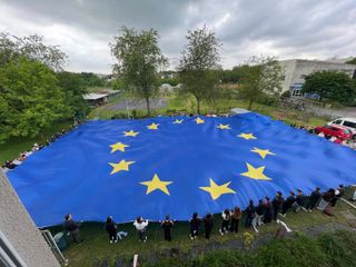 A conclusione degli interventi, i giovani insieme ai loro docenti hanno srotolato un’enorme bandiera europea di 20x30 metri, la seconda più grande al mondo, un simbolico momento di unione e appartenenza alla comunità europea.